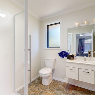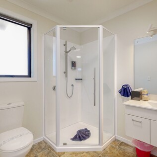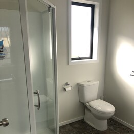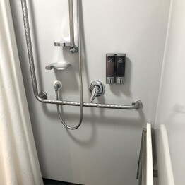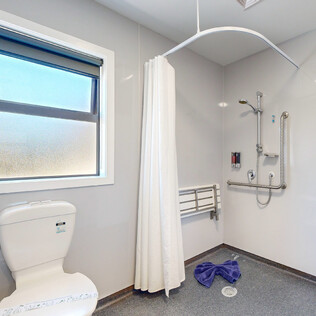 - Full wet bathroom with handrails at toilet, handrail and seat in shower