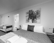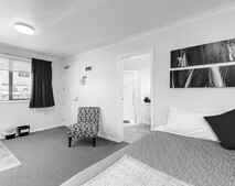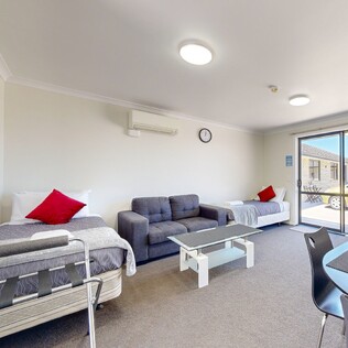 - Queen bed and 1 single bed in an open plan layout